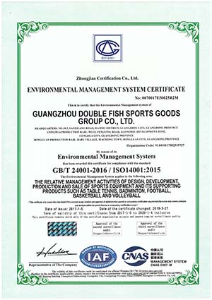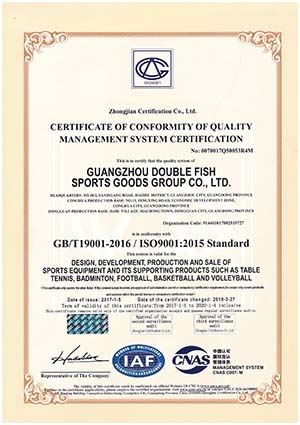 The company is one of the largest producers of sports supplies and equipment in China, whose main products include Double Fish table tennis sports supplies, Jinque badminton, Long Rainbow football, basketball and volleyball, Double Fish sports wears and all sorts of bags and cases and group sports supplies. The company has passed the certification of ISO9001 quality management system, ISO14001 environment management system and OHSMS18001 occupational health and safety management system. The company has led and participated in the formulation of 63 national standards, industrial standards and enterprise standards concerning sports equipment. In 2016, Double Fish Group was certified by the General Administration of Sports of China as a National sports industry demonstration unit for sports industry. The company has successively won honors such as a Well-known trademark of China, a Time-Honored Brand of Guangdong, a Time-Honored Brand of Guangzhou, a Guangdong High-Tech Enterprise, a Famous Trademark of Guangdong, Top 100 Enterprises Of China and an exemplary enterprise for independent innovation of the province.