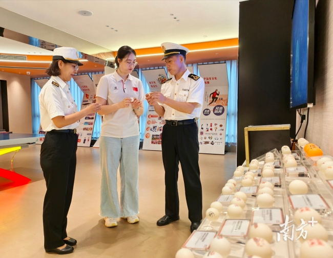 “这款经过国际乒联权威认证的乒乓球台,采用更高稳定性的台面材质,确保球感更优异、弹性更强劲。其全运会版也将同步亮相今年第十五届全国运动会的赛场。”9月16日,广州海关所属海珠海关关员在位于广州市海珠区的广州双鱼体育用品集团有限公司总部调研,该公司国际贸易部副部长达菲现场向海关关员介绍出口热销的“展梦3”乒乓球台。